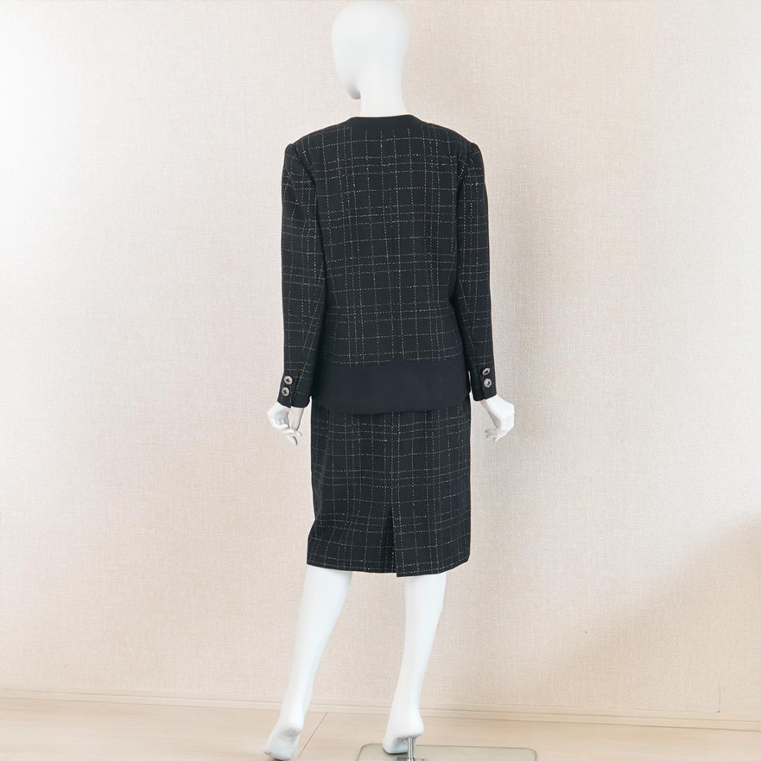 ◆重厚感のあるブラックのメルトン生地に、銀ラメ糸で施されたチェック柄が気品と優雅さを添えます。ノーカラーのジャケットは、縁取る無地の切り替えと、斜めに重ねたアシンメトリーなフロントデザインが印象的です。襟元にあしらわれた煌めくモチーフボタンが洗練されたアクセントに、内側はブランドロゴの刻印入りの隠しボタンで留める仕様です。すっきりとしたラインのタイトスカートと合わせたセットアップは、女性らしさを引き立て、ノーブルな佇まいを演出します。