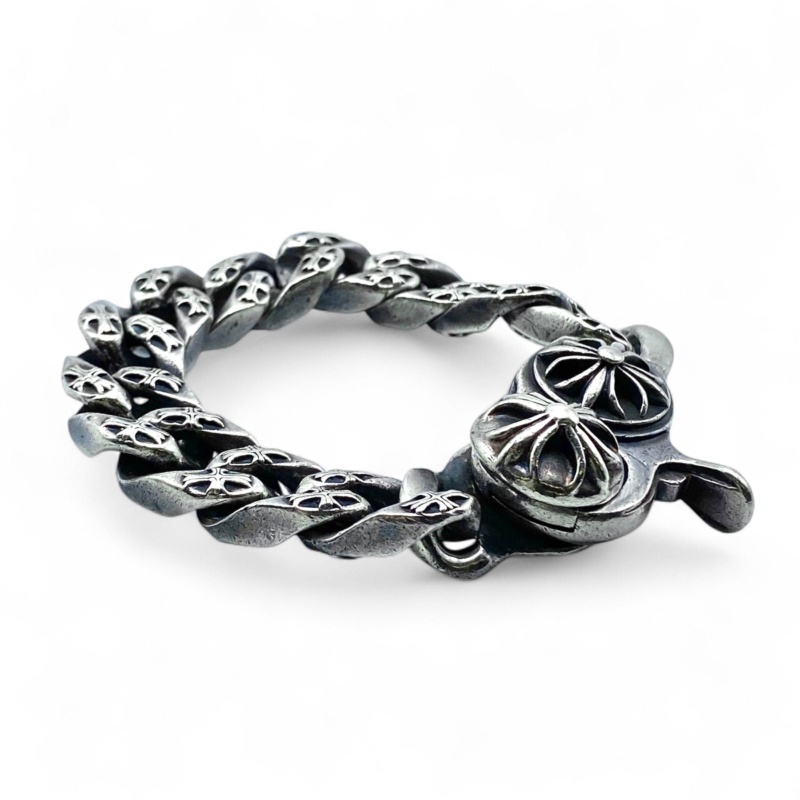一つひとつのコマにクロスモチーフを施したシルバー925製ブレスレット。厚みのあるチェーンと燻し仕上げが重厚感を引き立て、ラグジュアリーでありながらも力強い印象を放ちます。手元に圧倒的な存在感を宿す一本です。