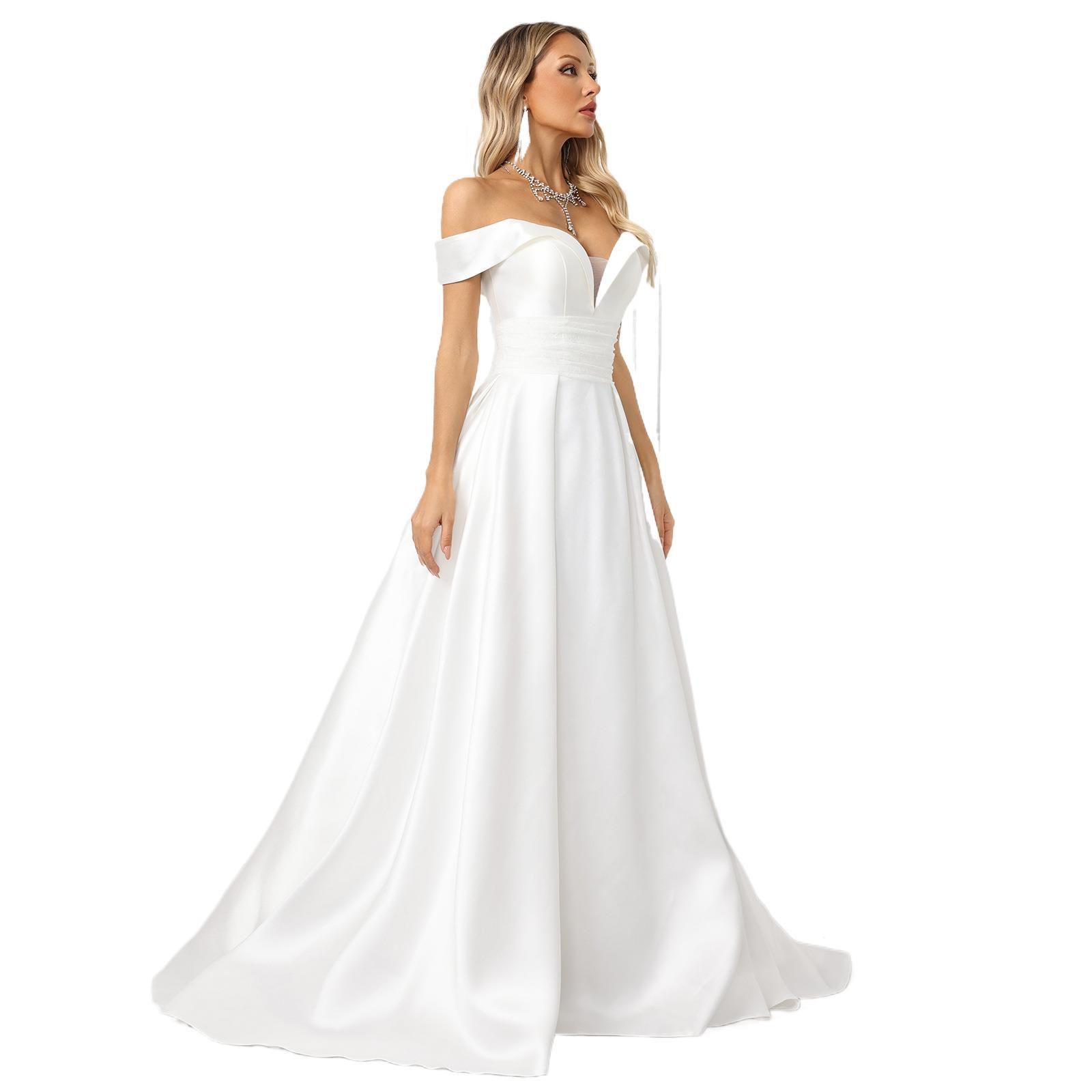 オフショルダーデザインでデコルテラインを美しく演出する缎面婚纱。