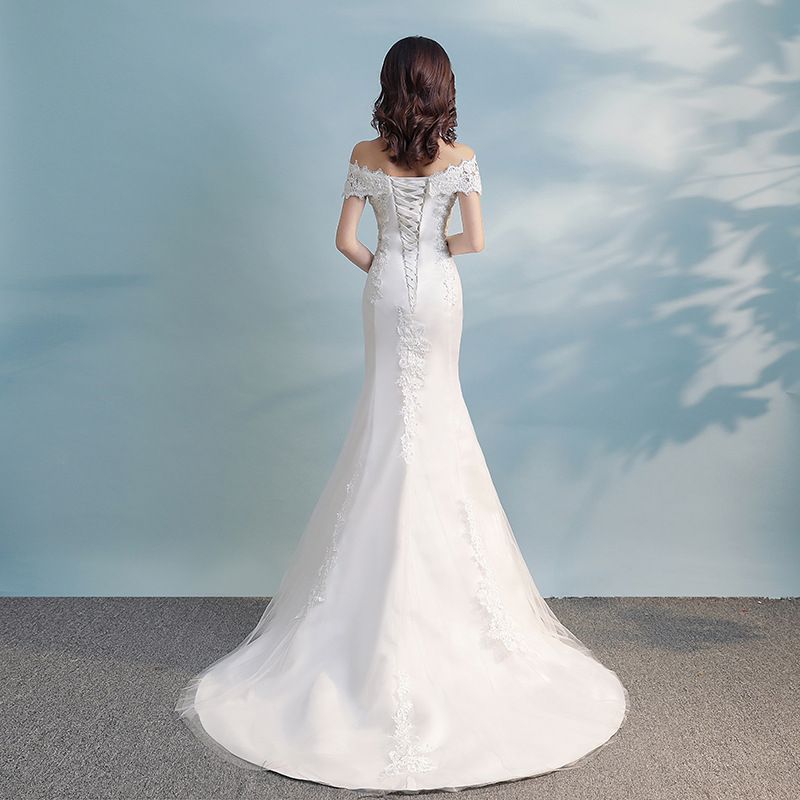 一字肩 フィッシュテール ロングトレーン ウエディングドレス 主婚纱 森系 公主 修身 新娘 轻婚纱