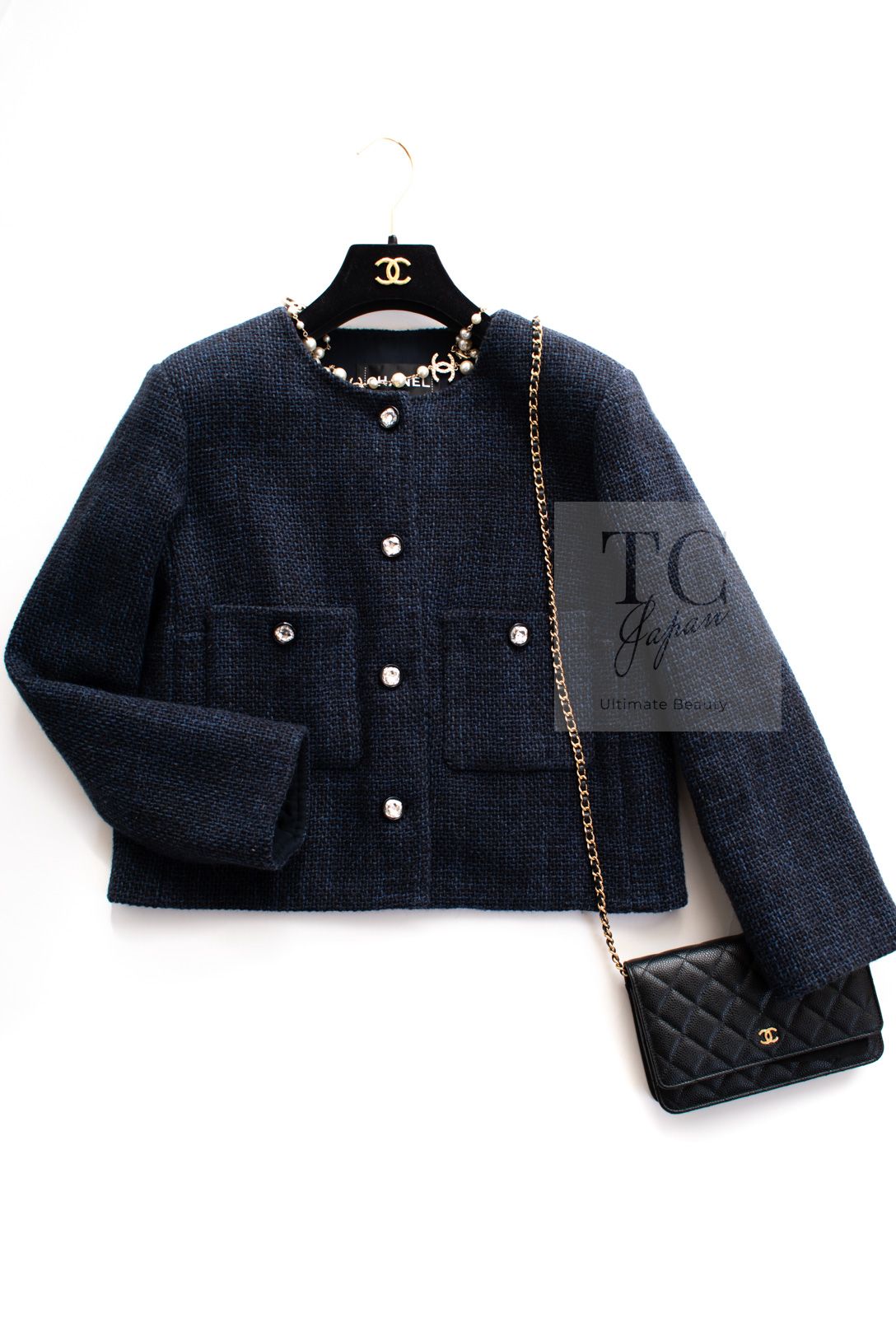 シャネル ジャケット CHANEL ブラック ネイビー クリスタル CC ロゴ ボタン ウール ツイード 永く使える スタイル ノーカラー 超 36