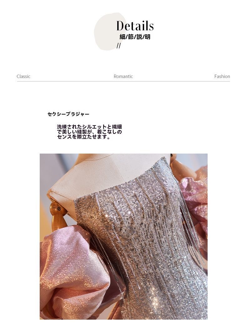 上品で華やかなシルバーグレーの抹胸マーメイドロングドレスでございます。短袖デザインと裾に向かって広がる魚尾スカートが、優雅で高級感あふれるシルエットを演出いたします。宴会、パーティー、結婚式、司会やフォーマルイベントなど、幅広いシーンに最適でございます。