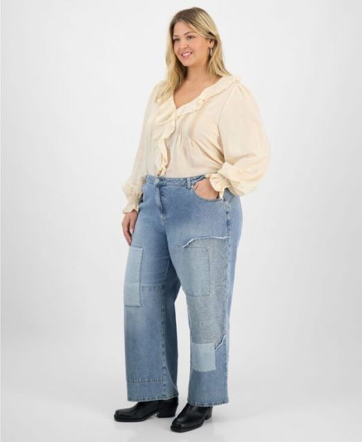 TrendyPlusSizePatchworkHighRiseWideLegJeans