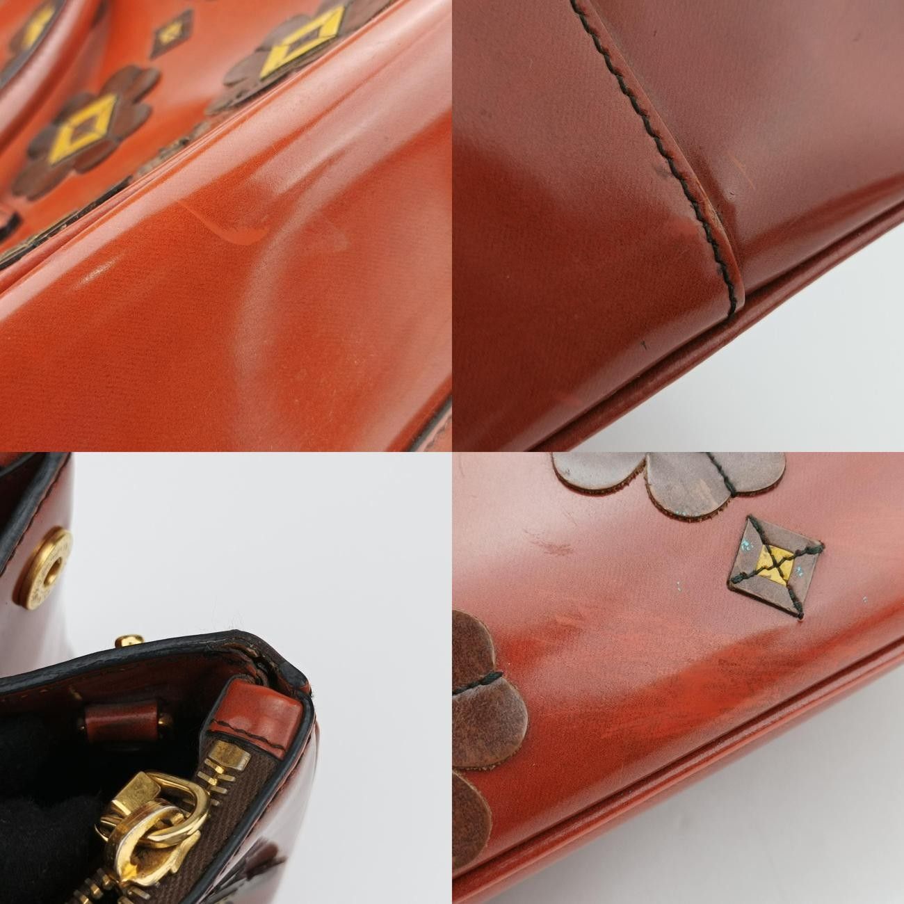 プラダPradaミディアムフローラルアップリケダブルジップレッド×ブラウン×イエローパテント