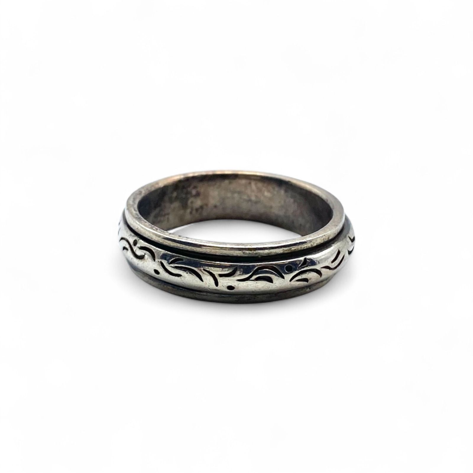 シルバー925をベースに、繊細な唐草模様を彫り込んだリング。燻しによるコントラストが模様を際立たせ、クラシカルで落ち着いた印象を与えます。経年の風合いが加わり、奥深い魅力を放ちます。また、中央部は回転する仕様となっており、遊び心が感じられます。