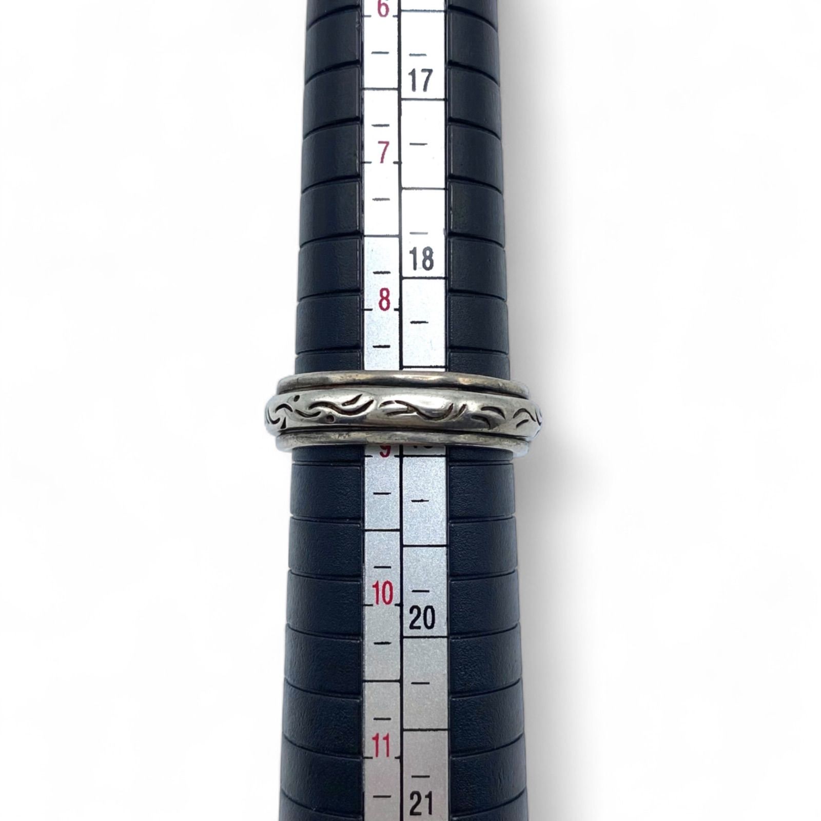シルバー925をベースに、繊細な唐草模様を彫り込んだリング。燻しによるコントラストが模様を際立たせ、クラシカルで落ち着いた印象を与えます。経年の風合いが加わり、奥深い魅力を放ちます。また、中央部は回転する仕様となっており、遊び心が感じられます。
