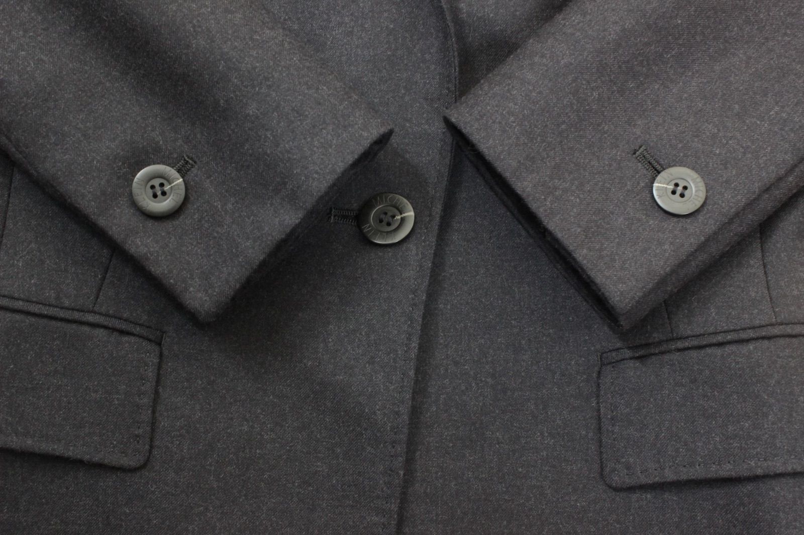 ジャケットは,1つボタン・総裏仕立て・センターベント・袖ボタン本開き。両腰ポケットには仕付け糸がついたままの状態です。