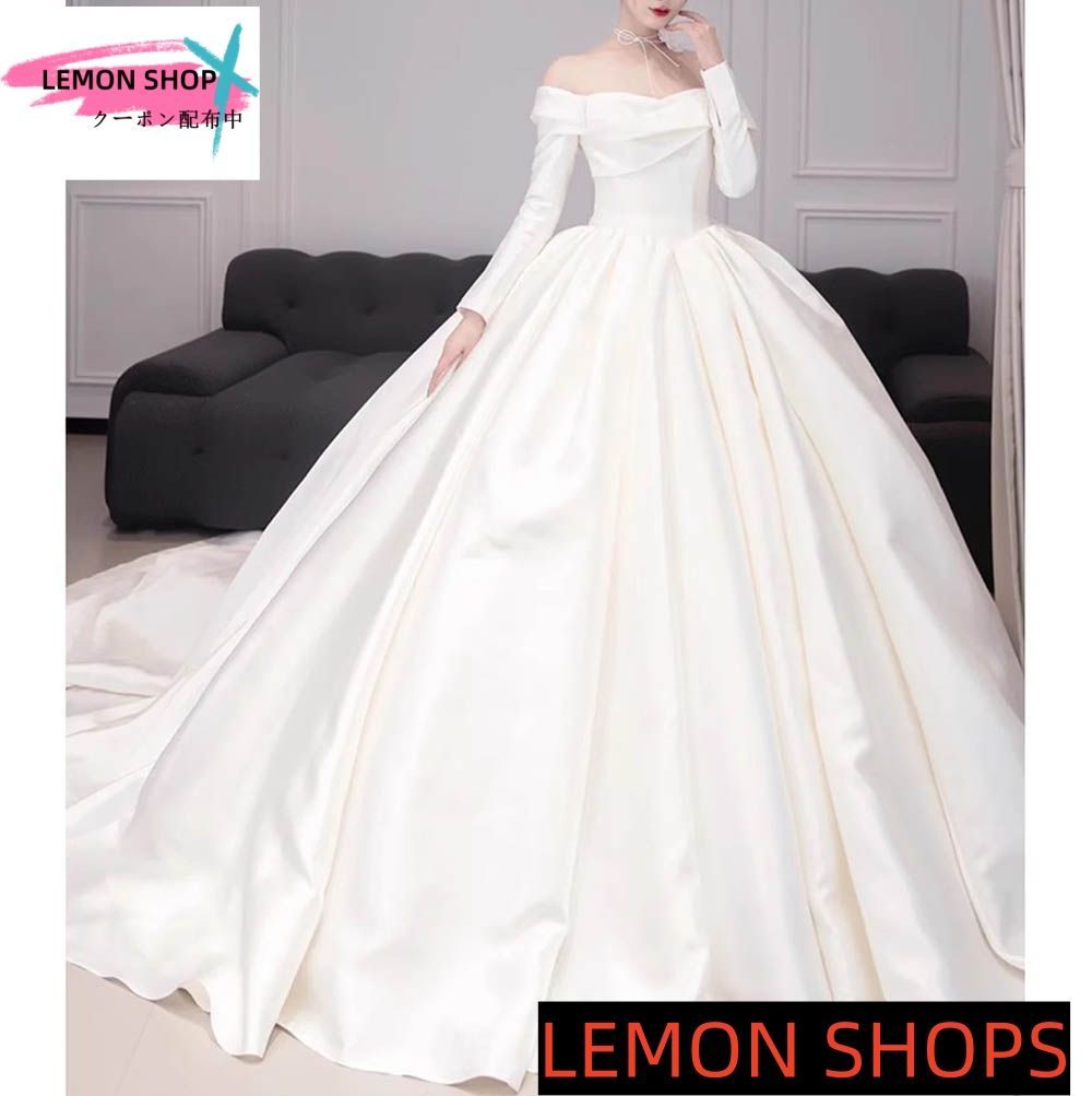 ♥ 2025 ウェディングドレス ロングドレス 結婚式 ウエディングドレス 長袖 Aラインドレス 二次会 花嫁 前撮り エレガント オフショルダー サテン ホワイト シンプル ロングトレーン 披露宴 LEMON