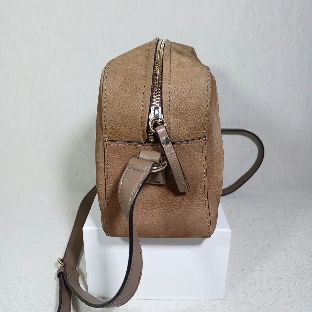 これは柔らかいスエード製のトスクロスボディバッグです。ほのかな茶色が高級感をプラスします。ポイントはバッグの正面に刻印されたロゴです。ご不明な点がなければ、すぐに安心してお支払いいただけます!