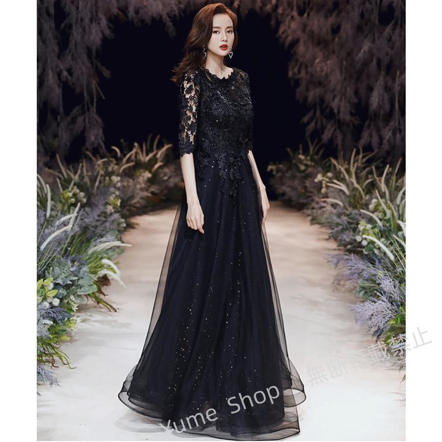 ♥ カラードレス ブラック ワインレッド 5分袖 ロングドレス 演奏会 発表会 大人 パーティードレス ファスナー レース カクテルドレス フォーマル 黒 赤 キラキラ nhdw 118