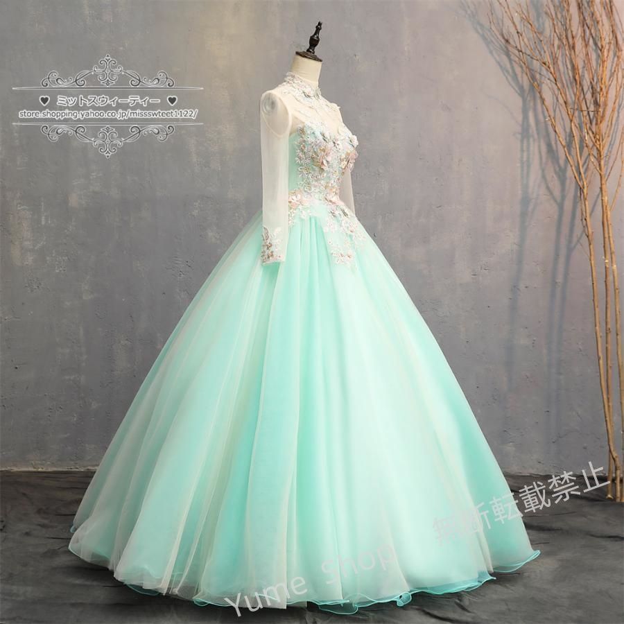 ♥ カラードレス ロングドレス 演奏会 演出 プリンセス ステージ 舞台衣装 発表会 コンサート コンクール 大人 ライトグリーン 長袖 花 結婚式 春色 二次会 花嫁 nhdw 19