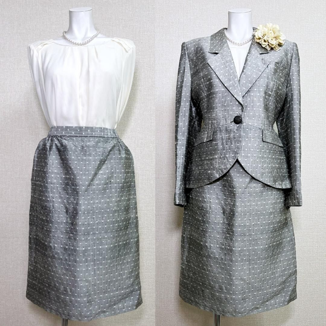 シルク100%の軽さと張りのある素材です。畝のある糸も使用した光沢グレーに白点模様が織り込まれており、趣き深い上品な生地です。テーラードジャケットは右胸の箱ポケットと、ウエストのフラップポケットでかっちりとした印象に。ペプラムの後ろにはプリーツが施されバックスタイルもエレガントです。タイトスカートと合わせて女性らしいシルエットに。結婚式など晴れやかなシーンに相応しい装いになります。