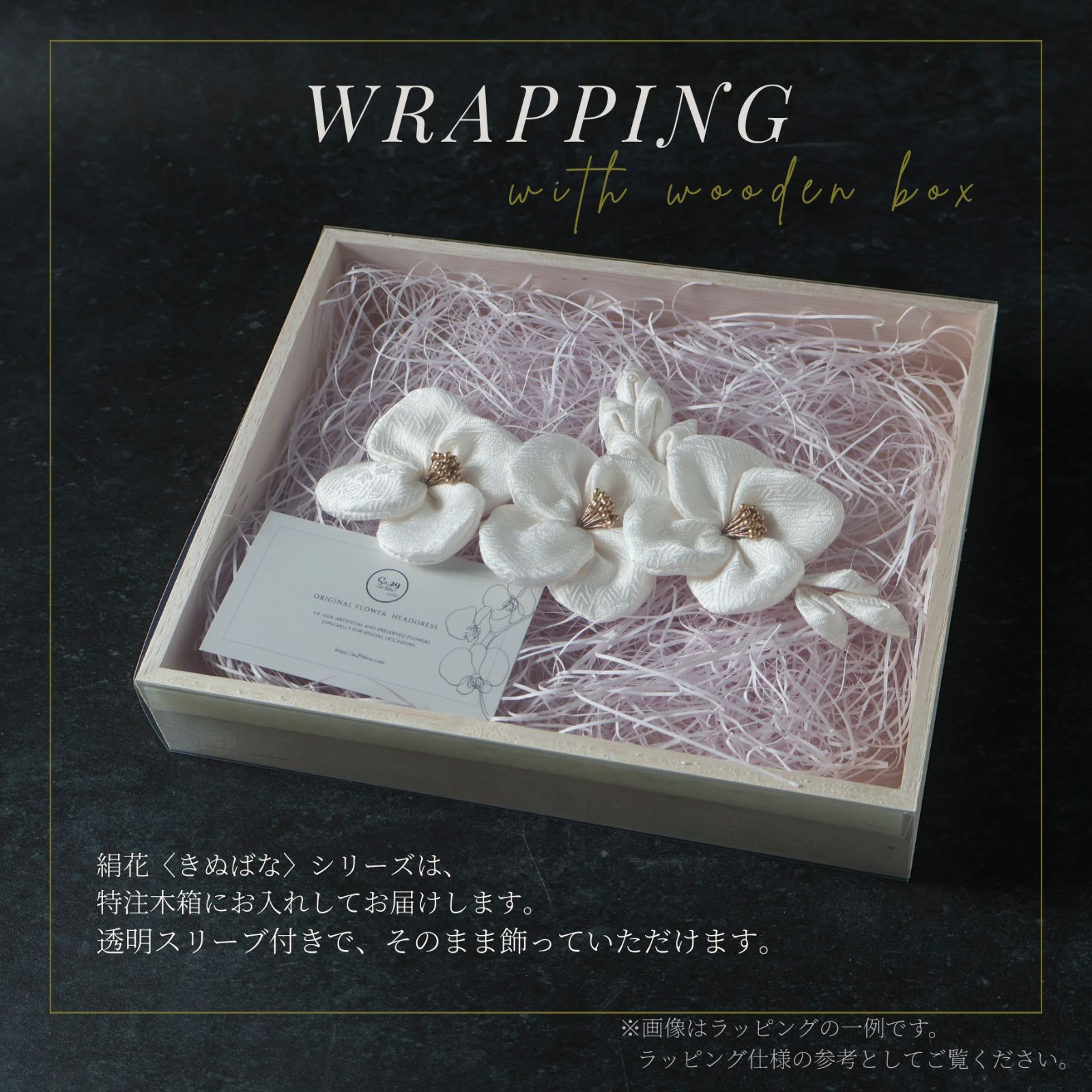 木のぬくもりあるボックスが絹花をやさしく守り、ご使用後もそのまま飾っていただけます。